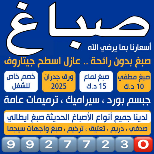 أخيرا صباغ الكويت يكون في خدمة جميع المواطنين من كافة أنحاء الكويت ويعمل على مدار اليوم وعلى كامل الاستعداد لتقديم خدمات منافسة في الأصباغ والدهانات وكل ما يشمل أعمال الديكور وبأسعار منافسة إتصل علينا نصل في أسرع وقت.