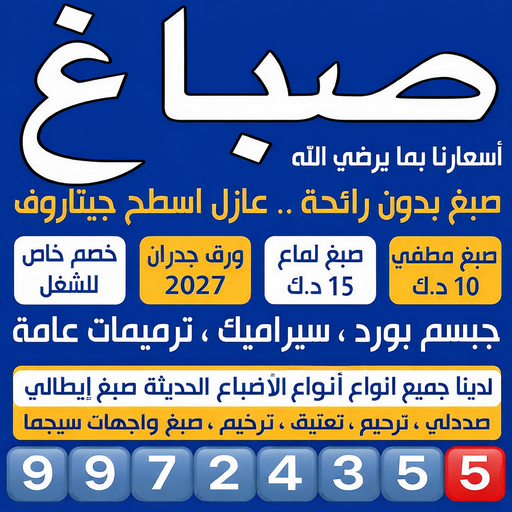 الحصول على رقم صباغ بالكويت أصبح أسهل من أي وقت مضى سواء عبر البحث على الإنترنت أو الاستفسار في المتاجر المحلية يمكنك العثور على رقم صباغ افضل صباغ بالكويت مستعد لتنفيذ خدمة الاصباغ بكفاءة.رقم صباغ ابحث عن رقم صباغ موثوق به لتلوين منزلك أو مكتبك. يقدم الصباغ الخدمات بكفاءة عالية ويتفهم احتياجات عملاؤه. رقم صباغ للتسهيل على العملاء في الوصول إليهم. هذا يتيح التواصل السريع والفعال للحصول على خدمات الصباغة المطلوبة بكل يسر.رقم صباغ بالكويت ابحث عن رقم صباغ محترف في الكويت لتلبية احتياجات تلوين منزلك أو مكتبك استمتع بجودة الخدمة والألوان الرائعة التي ستضيف لمسة فنية إلى أي مكان.